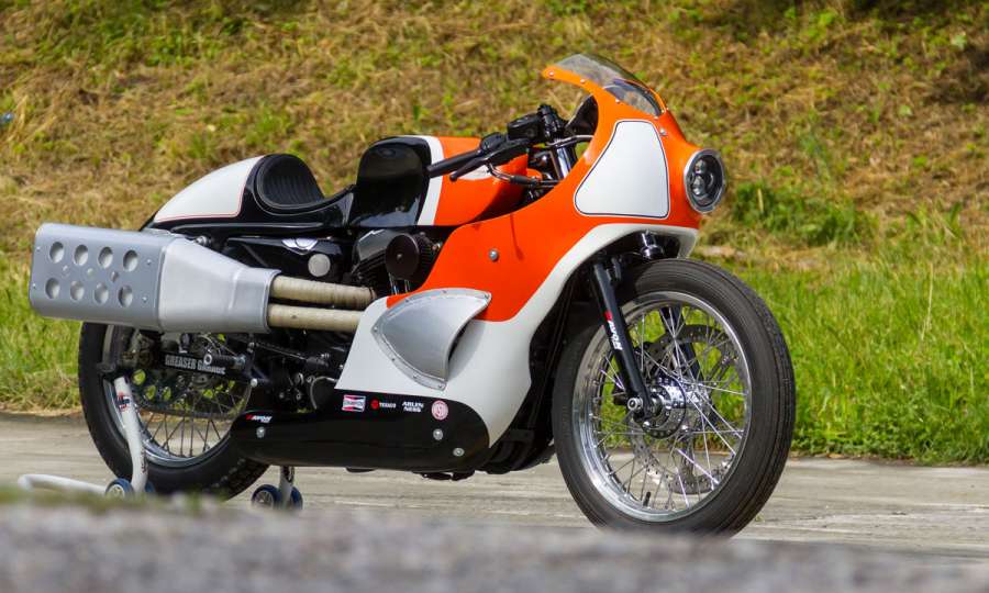 Эта штуковина впечатляет! Клиент пожелал нечто среднее между рекордными байками, гоняющими по соляному озеру Бонневиль, и мотоциклами, некогда выступающими в эндуранс-состязаниях. На заводскую раму навесили великолепно исполненный алюминиевый обтекатель с двумя воздухозаборниками для охлаждения V-твина. Об этом сообщает MotoNews.com.ua. Топливный бак также изготовлен из «крылатого металла». Еще одна впечатляющая особенность мотоцикла, приковывающая к себе внимание зрителей, – кастомная выпускная система с глушителем в стиле гоночных снарядов 30-х годов, имеющим керамическое покрытие и алюминиевый экран. А как хорош «хвост» и узкие шины Avon!